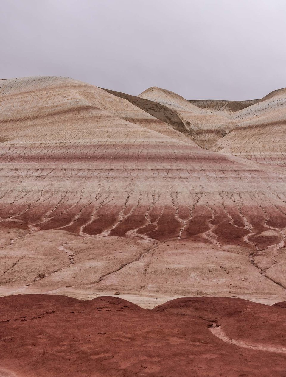 Next, you’ll wander through Kyzylkup Valley, nicknamed the Tiramisu Cliffs for their striped sedimentary layers that look like a giant’s slice of cake. The cliffs stack creamy whites, dusty browns, and soft rouge into perfect horizontal lines.